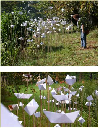 ALLMAELICHE GEWOEHNUNG AN VERSCHWUNDENE UFER Nach einer taufrischen Spätsommernacht erlitten einige Papierboote „Schiffbruch“, was durchaus im Sinne des Künstlers war.